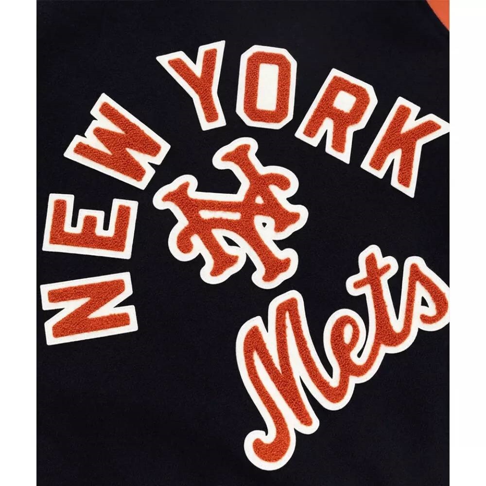 Hit a style grand slam with the Blue and Orange Aime Leon Dore Mets Varsity Jacket. This chic homage to baseball fandom seamlessly combines team spirit with fashion flair. The iconic blue and orange palette, coupled with meticulous detailing, makes it a standout piece for devoted Mets fans.