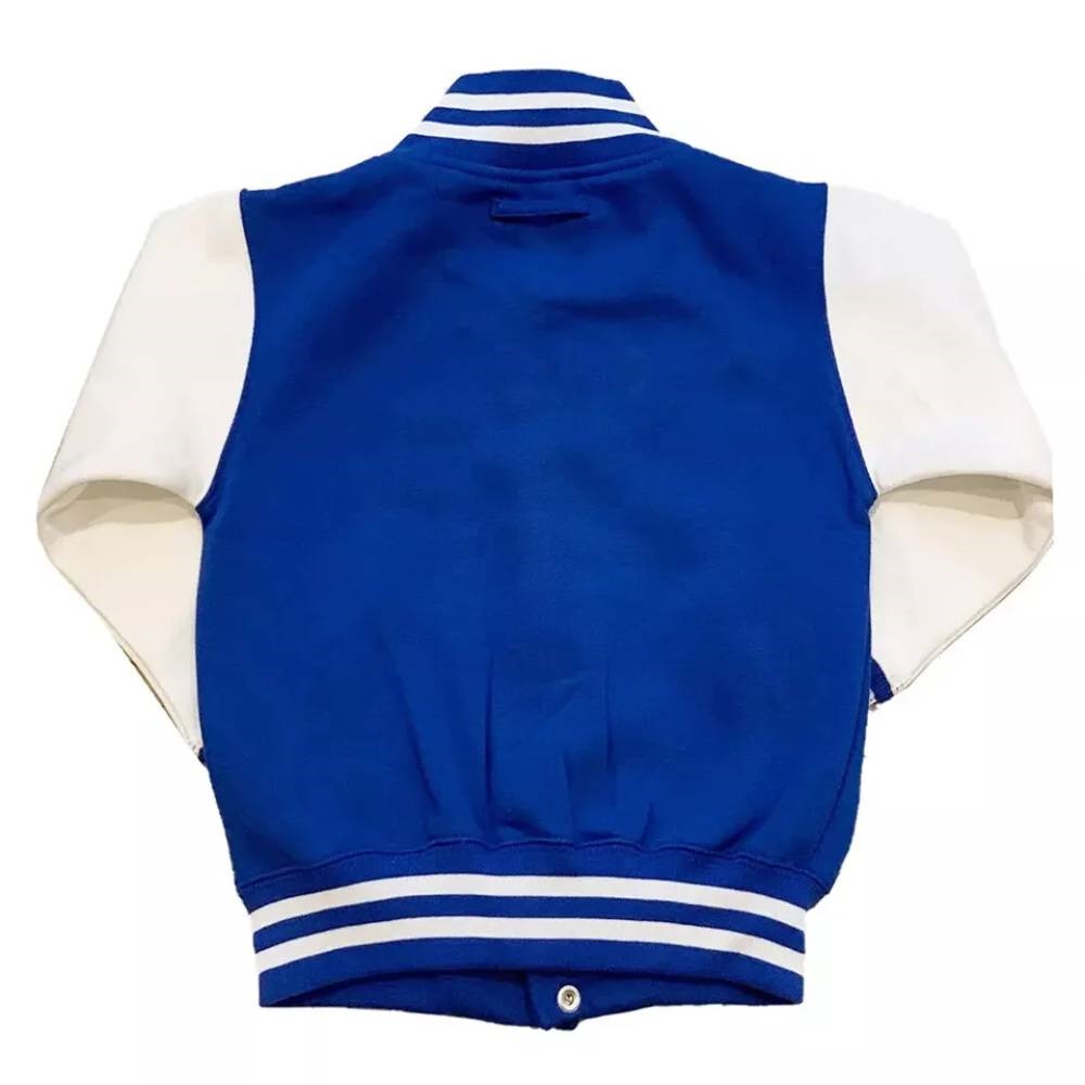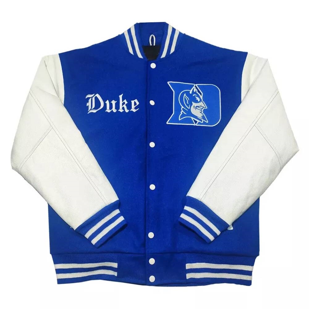 The Royal and White Duke Blue Devils Varsity Jacket is available to uplift your style with its attractive color combination of white and royal blue. This trendy jacket features a rib-knitted collar on top, a rib-knitted waistband, long sleeves with rib-knitted cuffs, and a snap-tab closure on the front to keep it fashionable. It has its body made of wool material and sleeves made of genuine leather material.